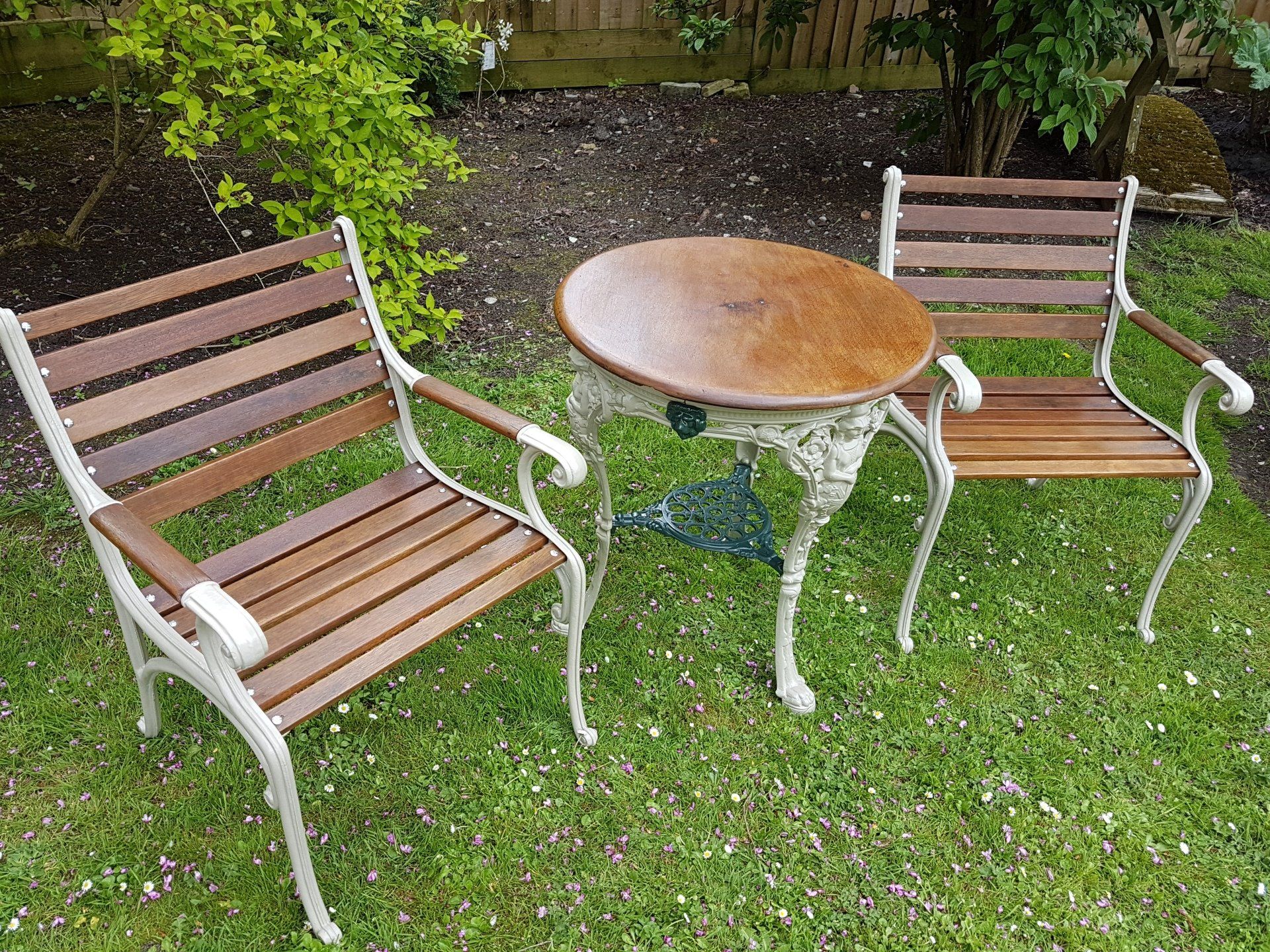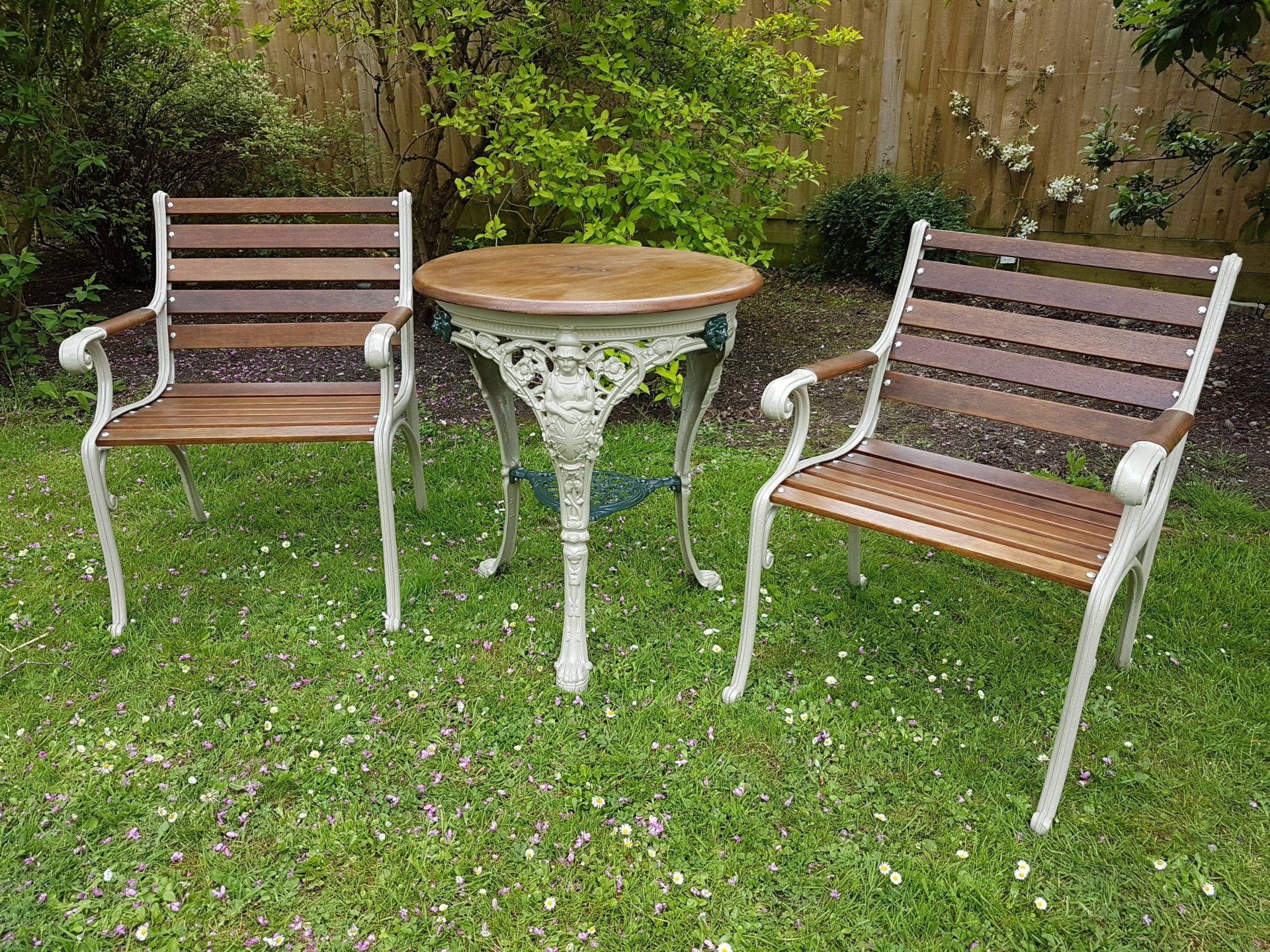 It was May of 2018 when we received a call from a distressed client regarding a table and pair of chairs that were on sale at Brownes Garden Centre just outside Wells in Somerset. The lady explained that she had admired them on a previous visit but was dismayed to find upon her return to purchase them that they had been sold. She therefore asked us if we had anything similar as she absolutely loved the quality and weight of the set. We checked our stock and found that indeed we had a set ready for renovation but it would be a few weeks to bring them up to standard.